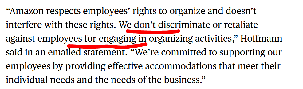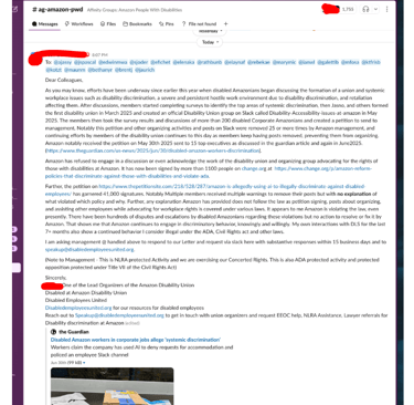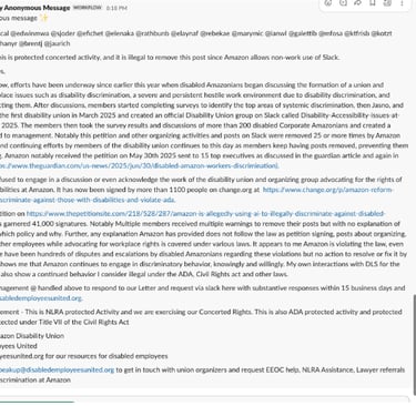 Is accurate. So glad the state of NJ understands how Amazon lies. See Amazon gives blanket statements stating they care about those with disabilities but its untrue. Just like they lied by saying they dont use AI or automation in the accommodations process with the Guardian, they lie alot to the public to cover up their mistreatment of disabled workers. Our group also represents those who are pregnant and needing accommodation as well as over 20 different disability types. Our published document (First published on our website here) shows that 255k Accommodations are requested in total each year. And our group of 600 disabled workers can attest that Amazon violates our rights. Further their continuous removals of disabled employees posts prove they are hell bent on stopping disability and ADA protected concerted activity. Ask yourself this question "if Amazon cares about disabled employees so much, why would they stop the speech of disabled Amazonians speaking up consistently. day after day and not allow their voices to be heard? That doesn't sound like someone that "cares" at all but more like an abusive one sided relationship.