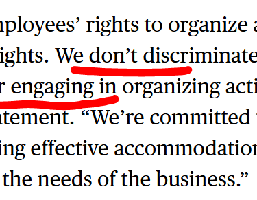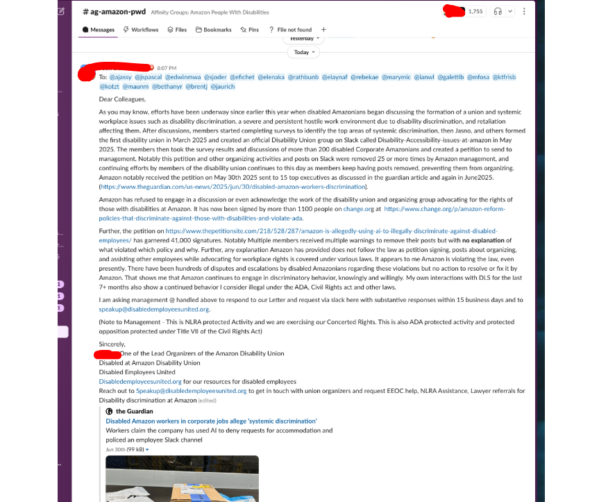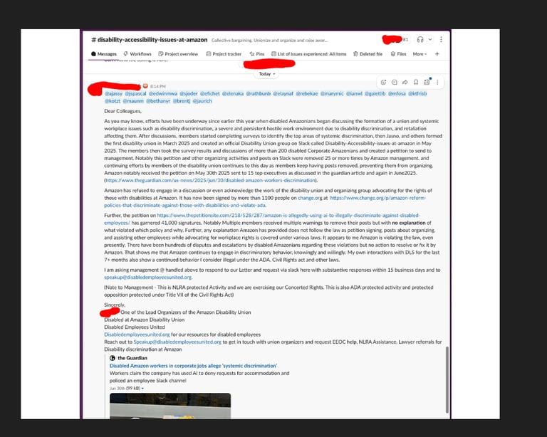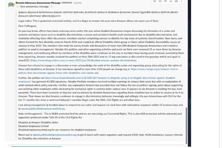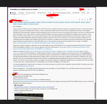 Today three posts of one of our lead organizers was removed in Violation of ADA, Civil Rights ACT and the NLRA. The member immediately said "THEY SHUT OFF MY ACCESS AFTER POSTING THOSE MESSAGES. THAT’S RETALIATION." and "Can't Login to the laptop, account totally suspended" This is to say that Amazon is continuously violating our rights when speaking up and think they are above the law. This person had their slack access removed right after the below 3 posts were taken down.