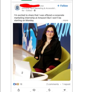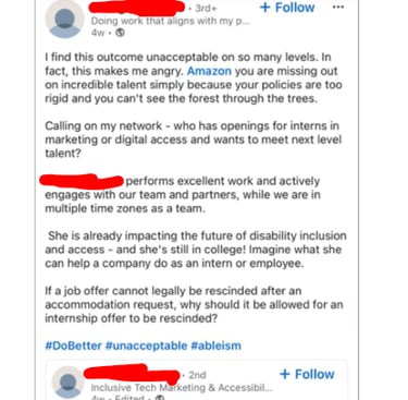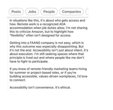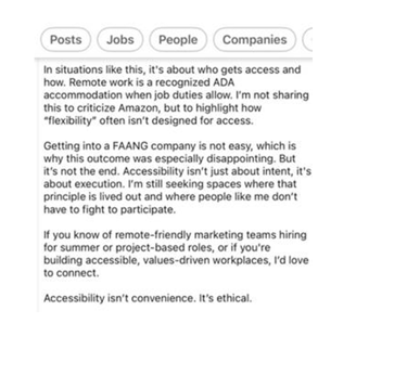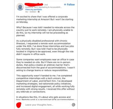 Here is an example where someone with a disability who is qualified with years of experience was denied the ability to work remotely and had a position revoked at amazon. The position did not require in person work and Amazon did not follow the ada. Amazon has been similar types of discrimination with tens of thousands of Amazonians till present day.