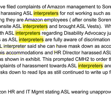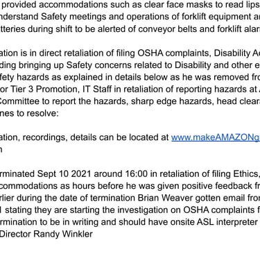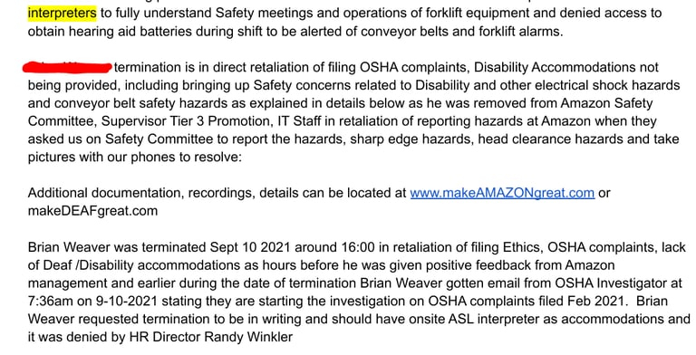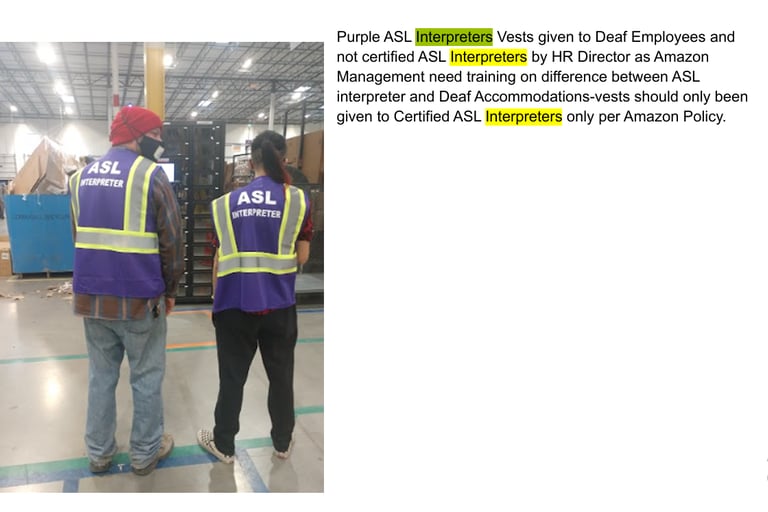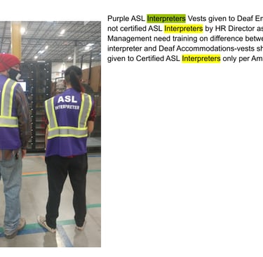 A member of our group who is deaf, recounts how multiple deaf employees at his site were denied ASL translators and non ASL certified people were provided ASL certified shirts. He also recounts stories where multiple ASL employees were retaliated against and where he was fired after bringing complaints of discrimination and OSHA complaints