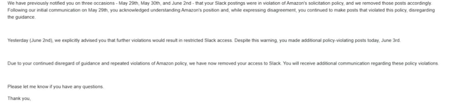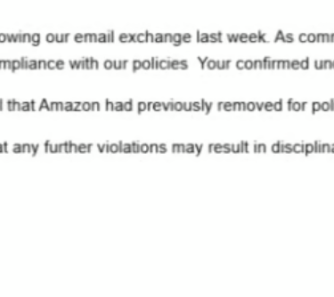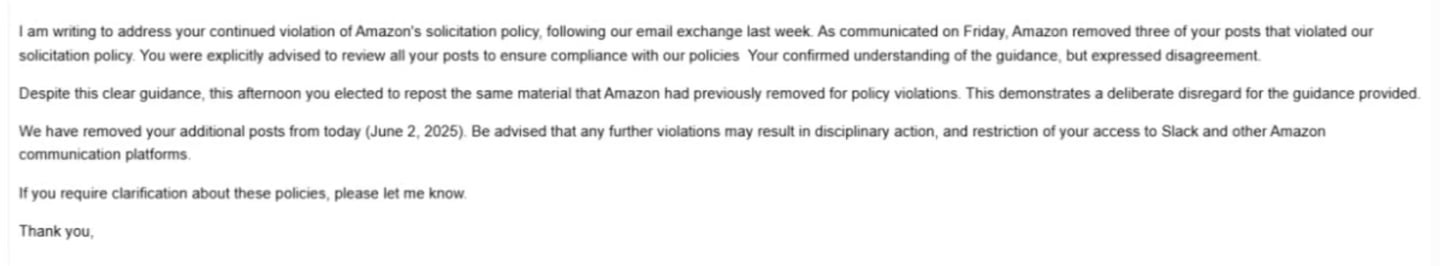 Warning messages sent by Amazon Management to organizers including Jasno saying to remove posts without explaining which posts or why
